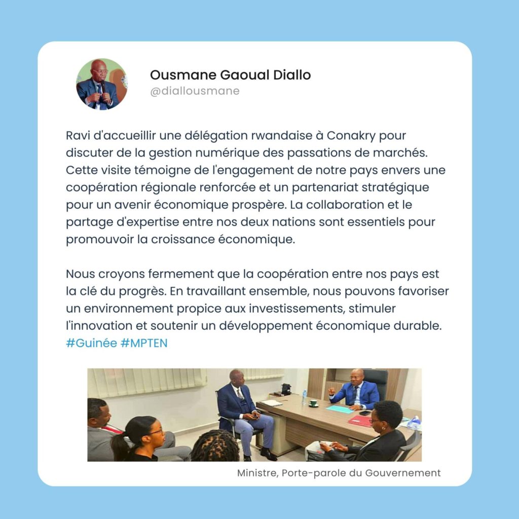 Ousmane Gaoual Diallo : « ravi d’accueillir une délégation rwandaise à Conakry pour discuter de la gestion numérique… »