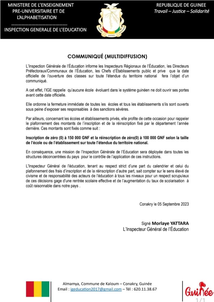 Dans un communiqué publié par le département de l’enseignement pré-universitaire et de l’alphabétisation ordonne le respect strict de calendrier de l’ouverture des classes en Guinée qui n’est pas encore connu.