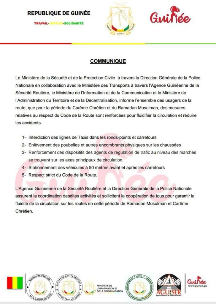 L’agence guinéenne de la sécurité routière, à travers le ministère de la sécurité, la direction générale de la police en collaboration avec le ministère des transports et celui de l’administration su territoire et de la décentralisation a, dans un communiqué informé l’ensemble des usagers que pour la période du carême chrétien et du ramadan musulman, des mesures strictes sont prises pour rendre fluide la circulation.