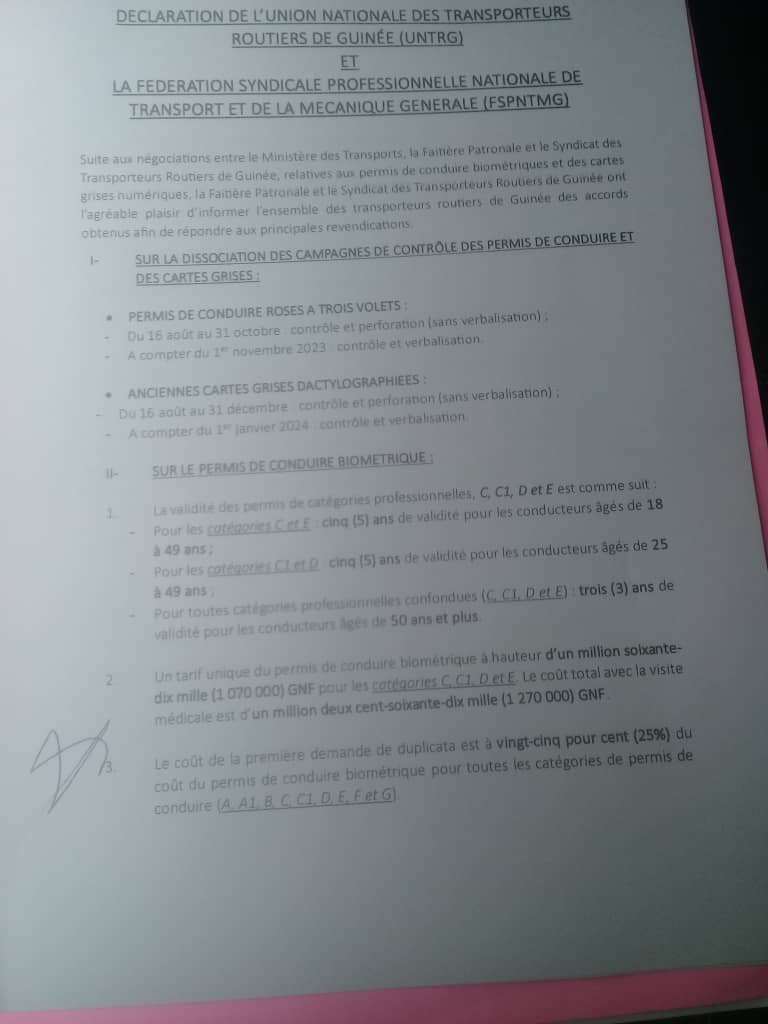 Permis de conduire et cartes grises : accords obtenus entre les transporteurs et le gouvernement guinéen (déclaration)