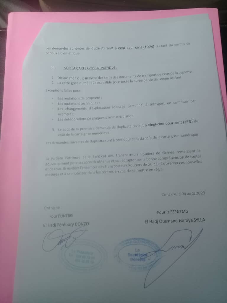 Enfin la fumée blanche est sortie des négociations entre l’Union Nationale des Transporteurs Routiers de Guinée, la Fédération Syndicale Professionnelle Nationale de Transporteurs et de la Mécanique Générale, et le Ministère des Transports. Ce vendredi 4 août 2023, plusieurs accords ont été obtenus autour de la dissociation des campagnes de contrôles, des permis de conduire et cartes grises.