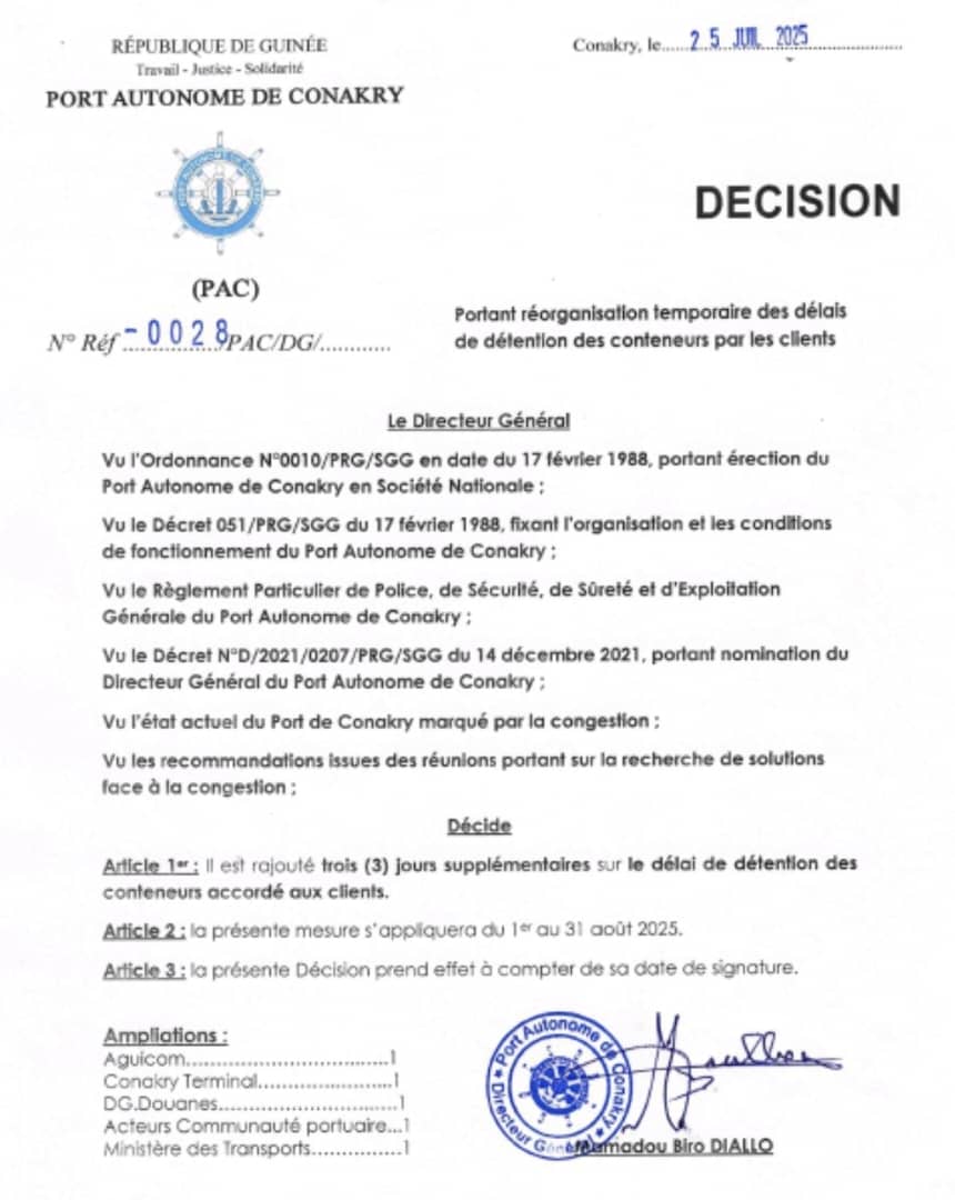 Face à la congestion persistante au Port Autonome de Conakry, la Direction Générale a décidé, à titre exceptionnel, d’accorder trois jours supplémentaires aux clients pour la détention de leurs conteneurs. Cette mesure temporaire sera en vigueur du 1er au 31 août 2025, conformément à une décision officielle signée le 25 juillet.