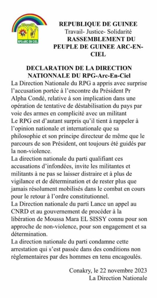 La direction nationale du RPG a appris avec surprise l’accusation portée à l’encontre du président Pr Alpha Condé, relative à son implication dans une opération de tentative de déstabilisation du pays par voie des armes en complicité avec un militant.