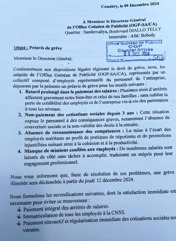 Dans une lettre envoyée au Directeur Général de l’Office Guinéen de Publicité (OGP), les employés, représentés par un collectif, ont déposé un préavis de grève en raison de retards prolongés dans le paiement des salaires, du non-versement des cotisations sociales, et de pratiques managériales jugées inéquitables. Une grève illimitée pourrait être déclenchée dès le 12 décembre 2024 si leurs revendications ne sont pas satisfaites.