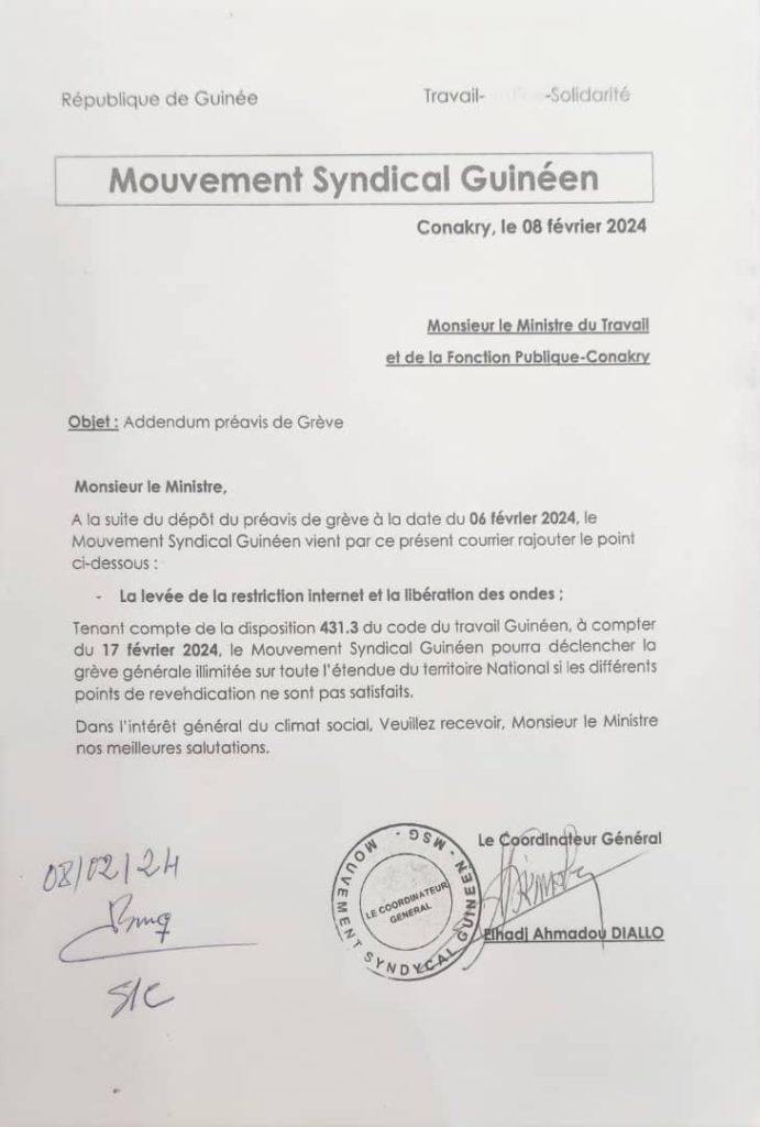 Le mouvement syndical guinéen vient de rajouter un nouveau point dans son préavis de grève générale du 06 février 2023.
