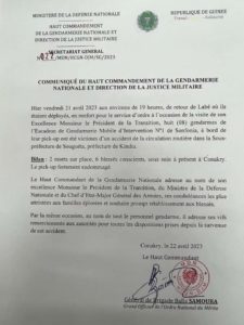 ActualitéSECURITE Précision de la gendarmerie sur l’accident de Kindia: « Deux morts et 6 blessés… » par Amadou Diouldé Diallo le Avr 22, 2023 0 Share Le haut commandement de la gendarmerie nationale a apporté des précisions sur l’accident de la route survenu dans la nuit du vendredi à Kindia. Dans un communiqué publié ce samedi 22 avril, le HCGN dresse un bilan de 2 morts et 6 blessés qui suivent des soins à Conakry. Ci-dessous le communiqué. Lisez ! Planete7. info Partager : Partager sur Facebook(ouvre dans une nouvelle fenêtre) Facebook Partager sur X(ouvre dans une nouvelle fenêtre) X 0 Share FacebookTwitterWhatsAppCourriel