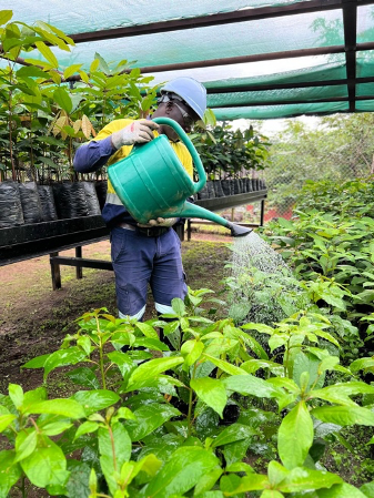 Trina Gill, la responsable de l’Environnement, nous explique que la pépinière réalisée produit chaque année en moyenne 7000 jeunes plants forestiers destinés d’une part à la réhabilitation progressive des sites dégradés, pour la construction des infrastructures ; et d’autre part, à l’enrichissement des poches de forêts servant de corridor de migration des chimpanzés vers la zone de protection intégrale de la forêt classée du Pic de Fon. Également au reboisement communautaire lors des campagnes lancées par l’Etat guinéen. La collaboration avec le Centre forestier de Nzérékoré est régulière. Le projet Simandou apporte aussi un appui financier et technique pour la mise en œuvre du plan d’aménagement de la forêt classée du Pic de Fon.