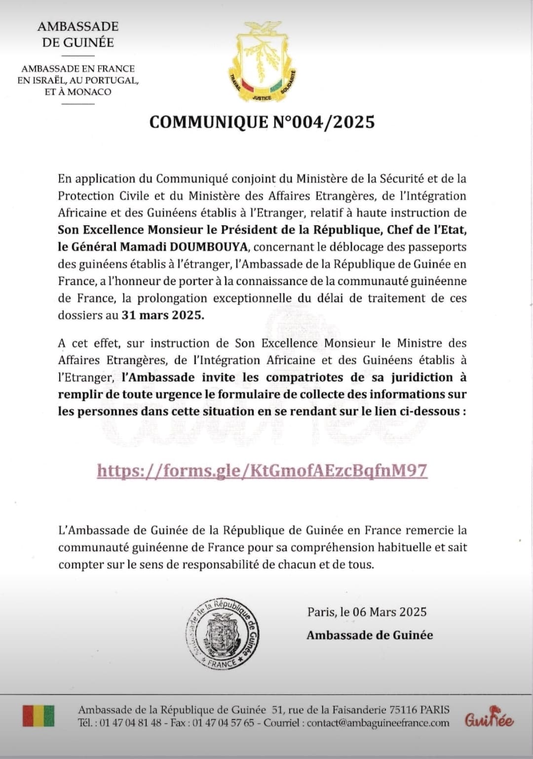 L’Ambassade de Guinée en France annonce la prolongation du délai de traitement des passeports des Guinéens établis en France jusqu’au 31 mars 2025. Cette décision, prise sur haute instruction du Président Mamadi Doumbouya, vise à faciliter le déblocage des documents de voyage pour les compatriotes concernés. L’Ambassade invite les personnes concernées à remplir en urgence un formulaire en ligne afin d’accélérer le processus.