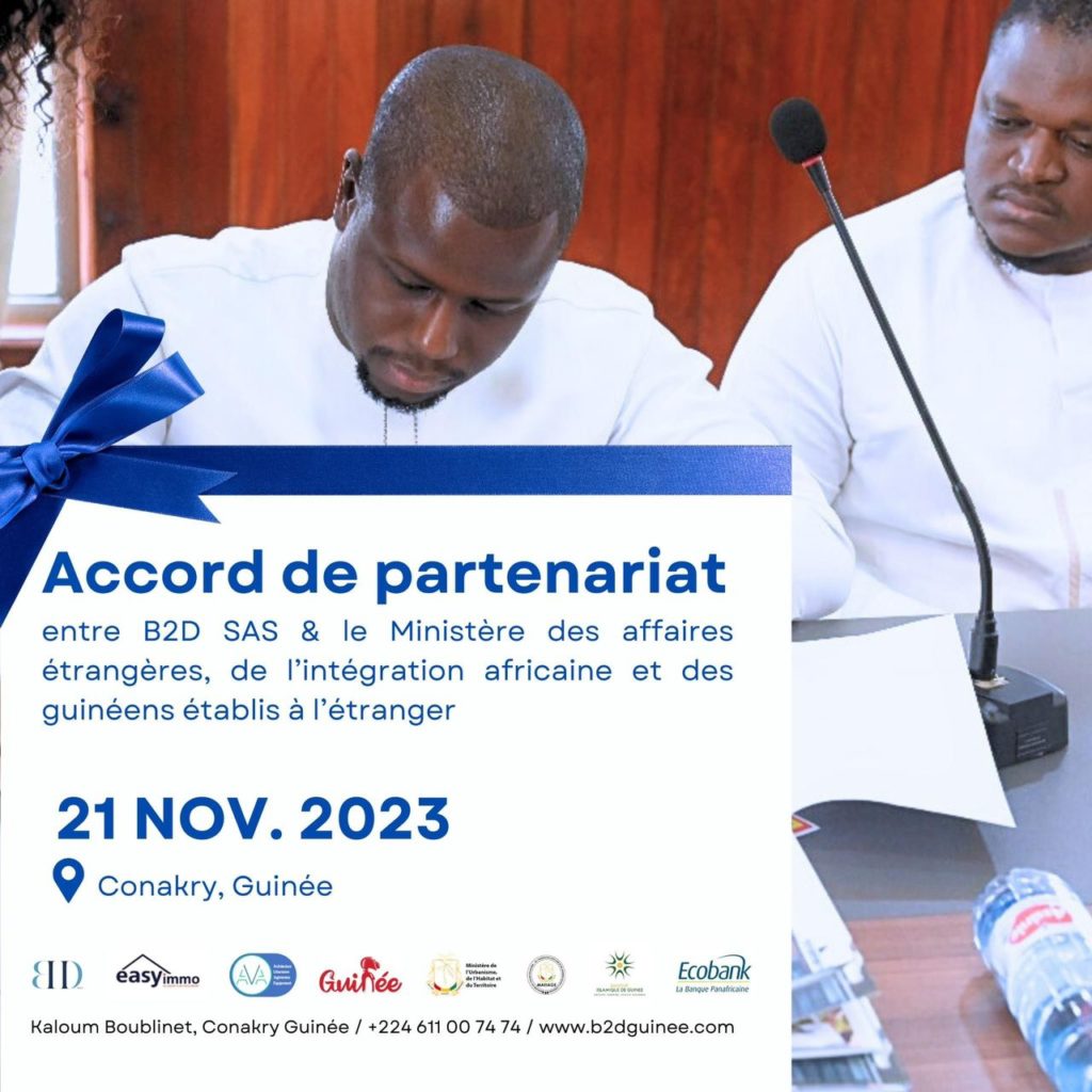 Dans le but d’encourager la diaspora guinéenne à investir dans le pays notamment dans l’immobilier, le ministère des affaires étrangères, de l’intégration africaine et des guinéens établis à l’étranger a signé ce mardi 21 novembre 2023, une convention de collaboration avec l’entreprise BIID, une entreprise de droit guinéen qui évolue dans l’immobilier.