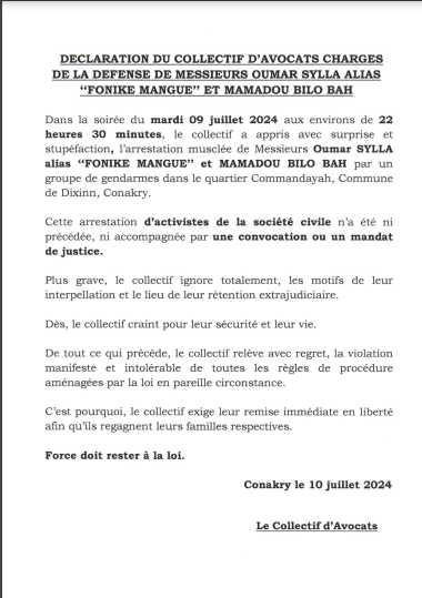 Les avocats chargés de la défense de Foniké Menguè et de Mamadou Bilo Bah condamnent la manière dont leurs clients ont été arrêtés ce mardi 09 juillet 2024. Dans une déclaration publiée ce mercredi, ils indiquent que cette arrestation n’a été ni précédée, ni accompagnée par une convocation ou un mandat de justice. Encore moins un motif. Ci-dessous la déclaration :