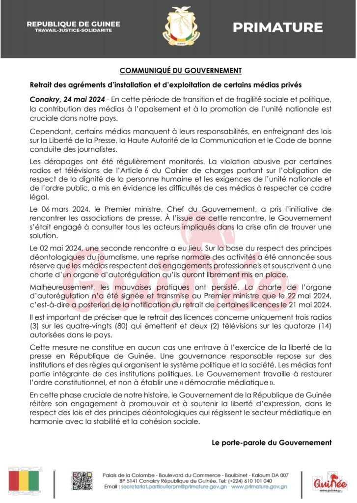 Dans un communiqué publié ce vendredi 24 mai 2024, le gouvernement guinéen indique que cette mesure vise à restaurer l’ordre public et l’unité nationale, après des tentatives de régulation et de dialogue avec les associations de presse, restées sans succès.