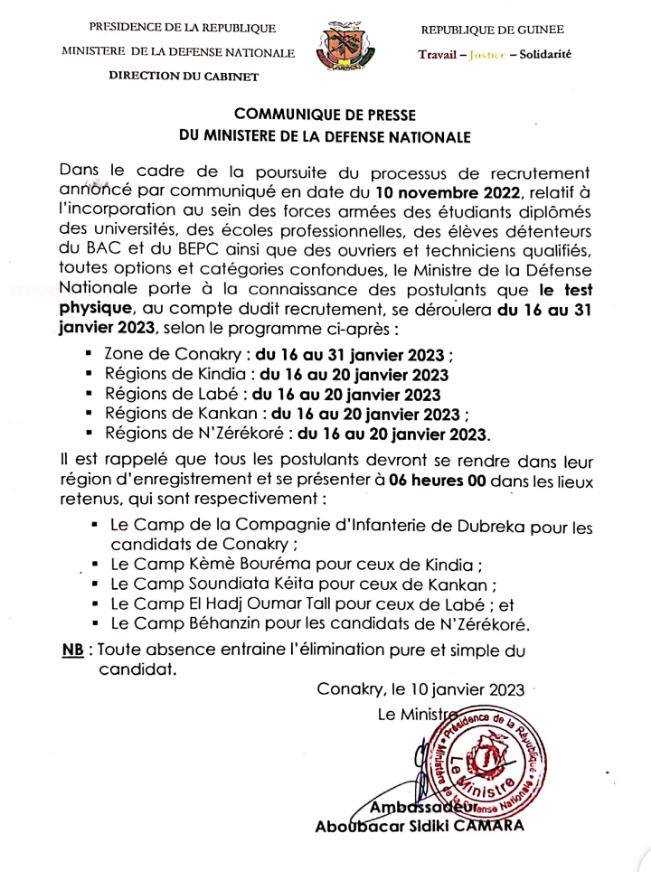 Le ministère de la défense porte à la connaissance des postulants que le test physique dudit recrutement se déroulera du 16 au 31 janvier 2023.