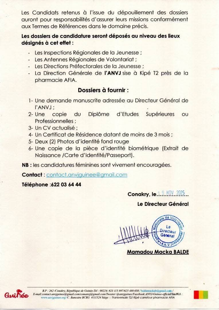 Le Ministère de la Jeunesse, à travers l’Agence Nationale du Volontariat Jeunesse (ANVJ), ouvre du 20 au 30 novembre 2025 les candidatures pour le recrutement, la formation et le déploiement de 300 jeunes volontaires à travers plusieurs régions du pays. Cette initiative vise à renforcer l’insertion socio-professionnelle des jeunes et à combler le déficit en ressources humaines dans les collectivités locales.