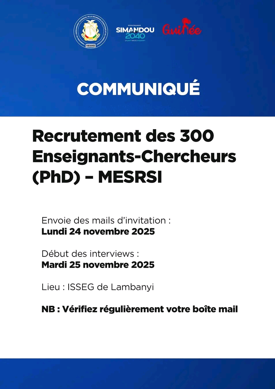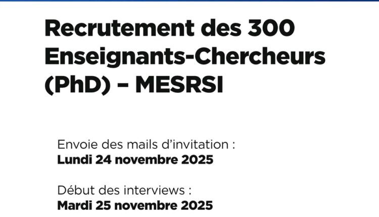 Dans le cadre du processus de recrutement des trois cents (𝟑𝟎𝟎) Enseignants-Chercheurs titulaires du 𝐏𝐡𝐃 au compte du Ministère de l’Enseignement supérieur, de la Recherche scientifique et de l’Innovation (MESRSI), il est porté à la connaissance des candidats que les mails d’invitation aux interviews seront envoyés le lundi 24 novembre 2025.