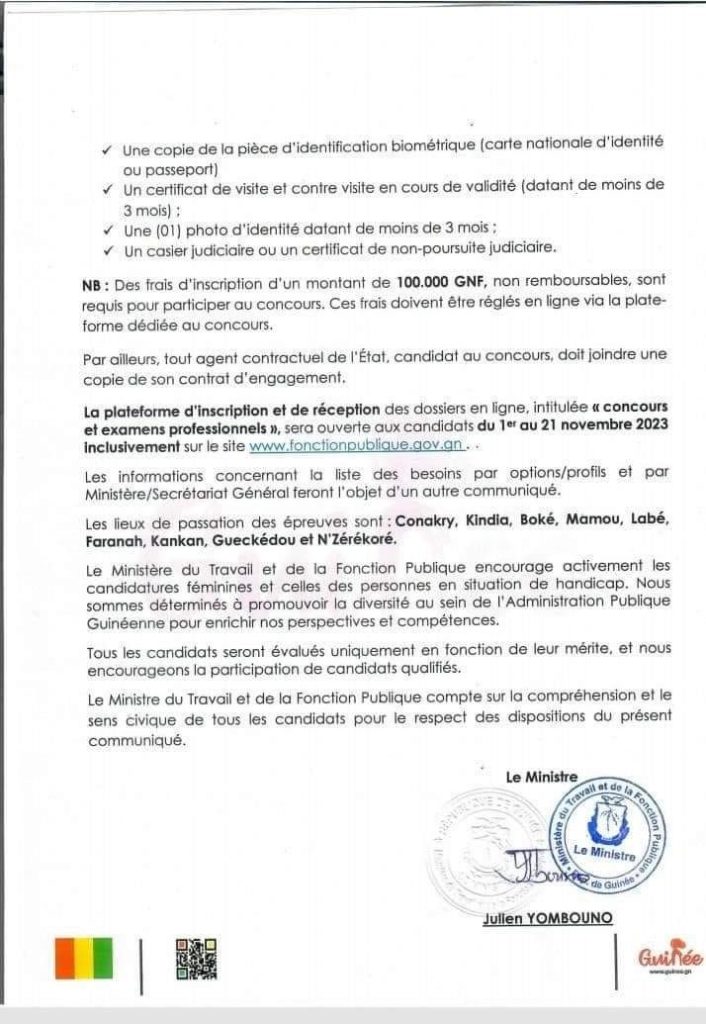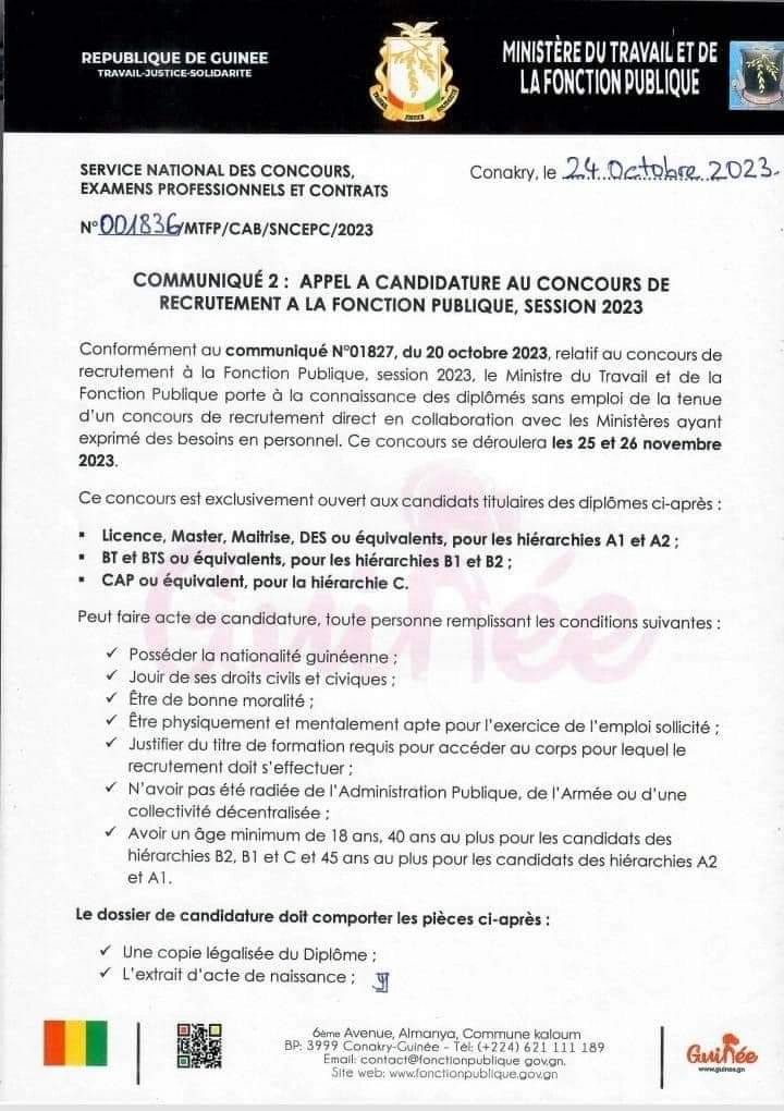 Ce recrutement des nouveaux fonctionnaires se déroulera les 25 et 26 novembre prochain. Autre précision apportée par le département, est que le dépôt des dossiers de candidature sera fait en ligne. Les intéressés peuvent postuler sur le site www.fonctionpublique.gov.gn.