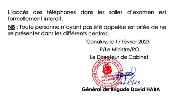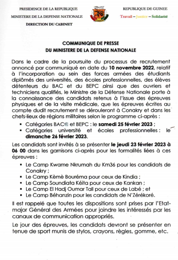 Dans un communiqué publié ce vendredi 17 février 2023, le ministère de la défense informe les candidats retenus pour le processus de recrutement au sein des forces armées que les épreuves écrites vont très bientôt démarrer à Conakry et les chefs-lieux de régions militaires.