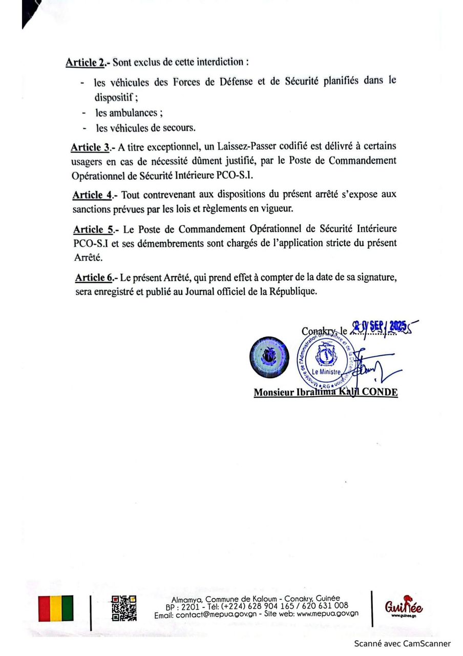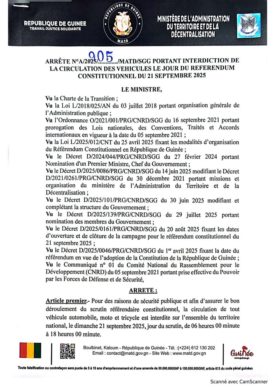 À l’occasion du scrutin référendaire prévu ce dimanche 21 septembre 2025, le ministère de l’Administration du Territoire et de la Décentralisation a pris un arrêté interdisant la circulation des véhicules, motos et tricycles de 6h à 18h sur l’ensemble du territoire national. Seuls les véhicules des forces de défense et de sécurité, les ambulances et les engins de secours sont exemptés de cette mesure.
