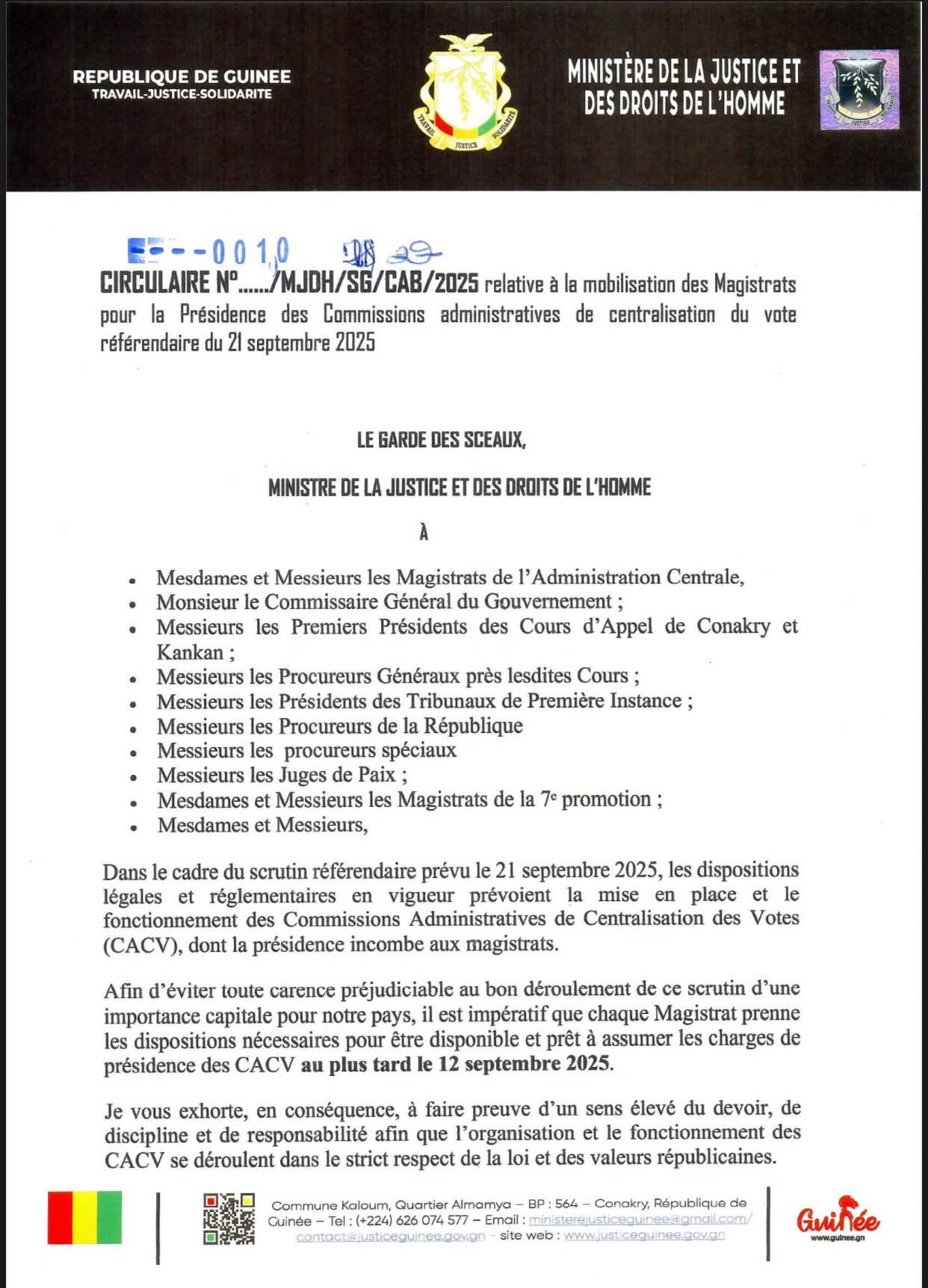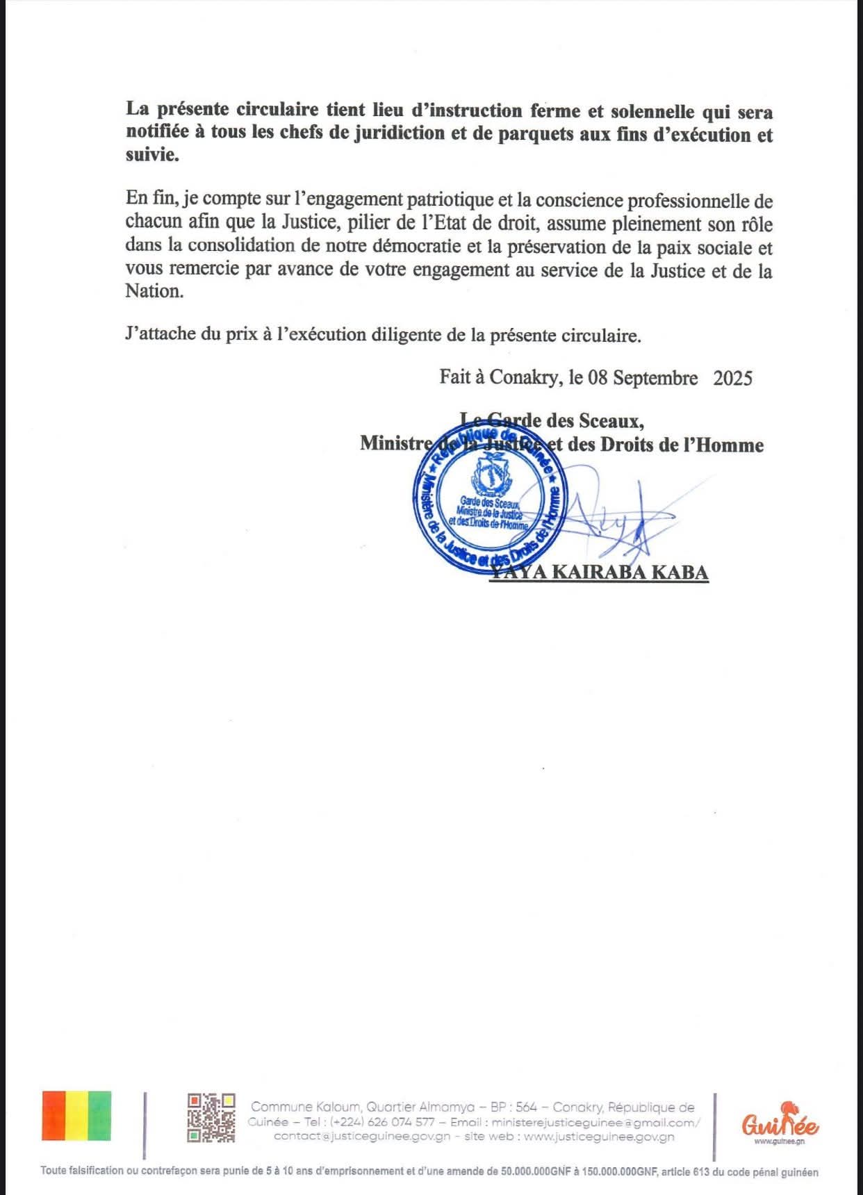 À travers une circulaire en date du 8 septembre 2025, le Garde des Sceaux, Yaya Kairaba Kaba, a enjoint l’ensemble des magistrats à se rendre disponibles pour assurer la présidence des Commissions Administratives de Centralisation des Votes (CACV). Il les exhorte à faire preuve de discipline et de responsabilité afin de garantir le bon déroulement du scrutin référendaire.