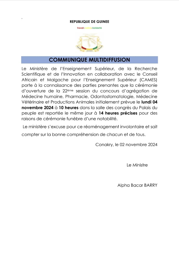 Le Ministère de l’Enseignement Supérieur et de la Recherche Scientifique informe que la cérémonie d’ouverture de la 22ème session du concours d’agrégation, prévue ce lundi 4 novembre au Palais du peuple, est exceptionnellement reportée à 14 heures pour permettre le déroulement d’une cérémonie funéraire importante.