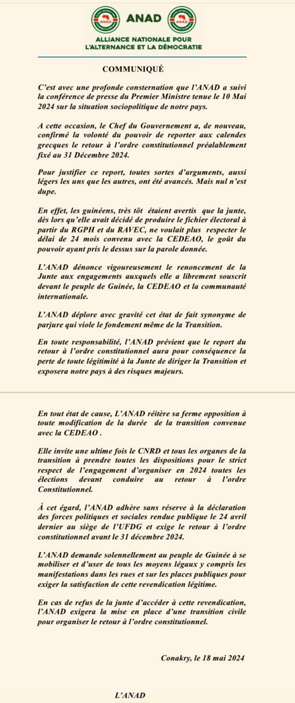L’ANAD prévient que le report du retour à l’ordre constitutionnel aura pour conséquence la perte de toute légitimité à la Junte de diriger la Transition et exposera notre pays à des risques majeurs.