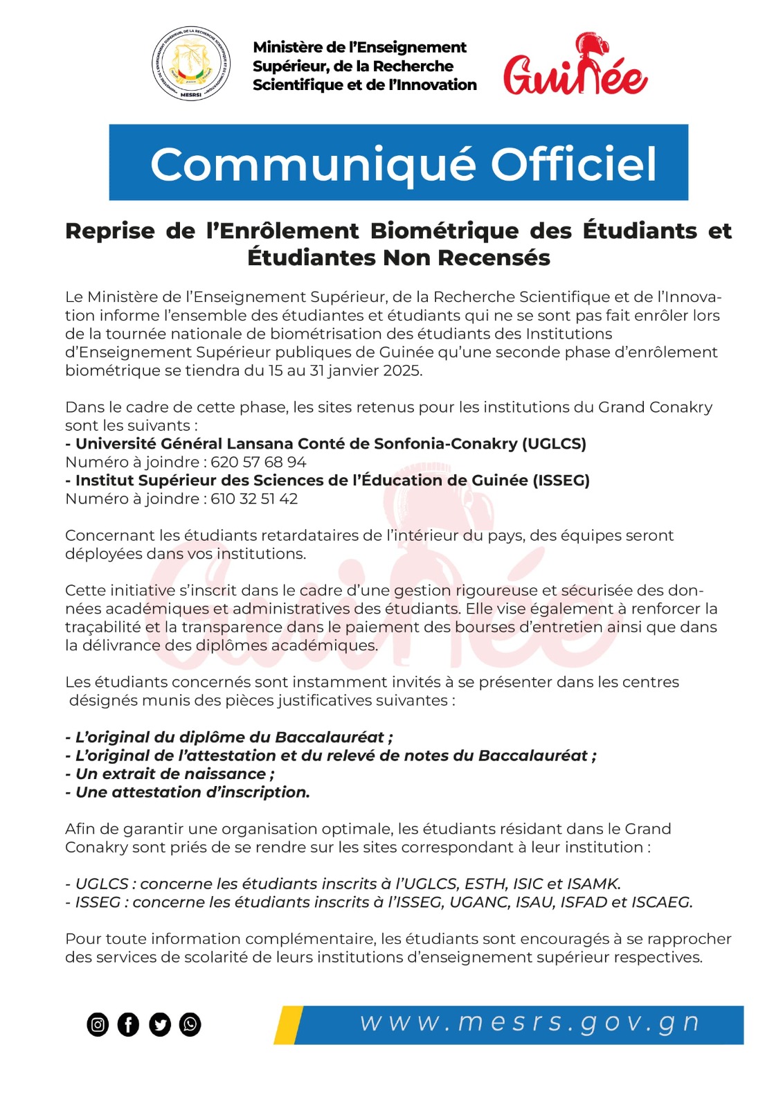 Le Ministère de l’Enseignement Supérieur, de la Recherche Scientifique et de l’Innovation annonce la reprise de l’enrôlement biométrique des étudiants non recensés des institutions publiques. Prévue du 15 au 31 janvier 2025, cette initiative vise à renforcer la gestion rigoureuse des données académiques et administratives tout en assurant transparence et traçabilité dans le paiement des bourses et la délivrance des diplômes.