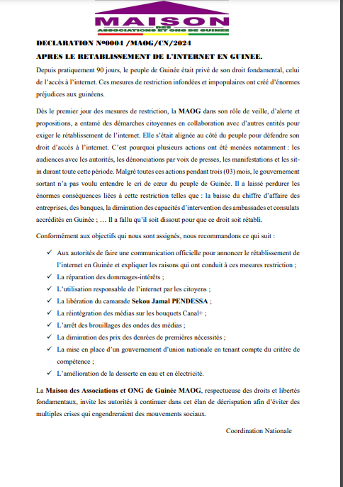 Dans une déclaration publiée ce vendredi 23 février 2024, la Maison des Associations et ONG de Guinée MAOG s’est prononcé sur le rétablissement de l’internet en Guinée. Dans sa déclaration, la MAOG se félicite de cette décision qui permet désormais aux Guinéens de surfer sans contrainte sur les réseaux sociaux.