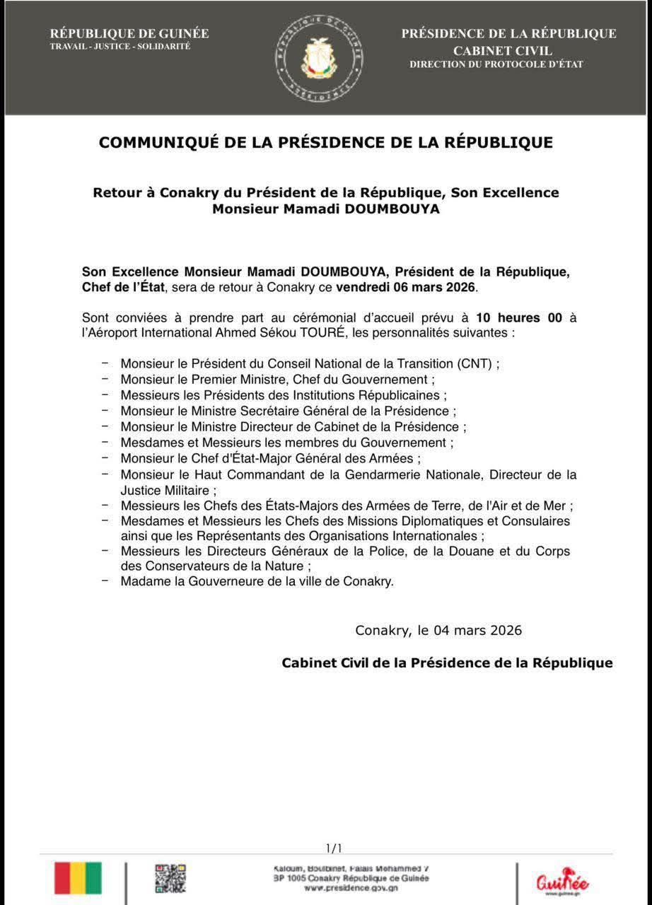 Dans un communiqué officiel, la Présidence de la République de Guinée informe que le chef de l’État, Mamadi Doumbouya, effectuera son retour à Conakry ce vendredi 6 mars 2026. Une cérémonie d’accueil est prévue à l’Aéroport international Ahmed Sékou Touré, en présence de plusieurs autorités institutionnelles, gouvernementales et diplomatiques.