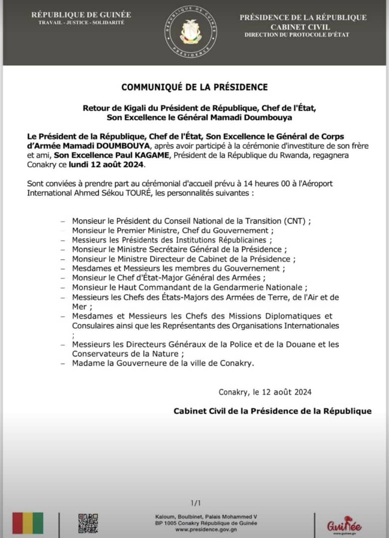 Le Président de la République, Son Excellence le Général Mamadi Doumbouya, regagnera Conakry ce lundi 12 août 2024, après avoir assisté à la cérémonie d’investiture du Président rwandais, Paul Kagame. Un cérémonial d’accueil est prévu à 14 heures à l’Aéroport International Ahmed Sékou Touré, en présence de hautes personnalités du pays, des membres du gouvernement, et des représentants diplomatiques.