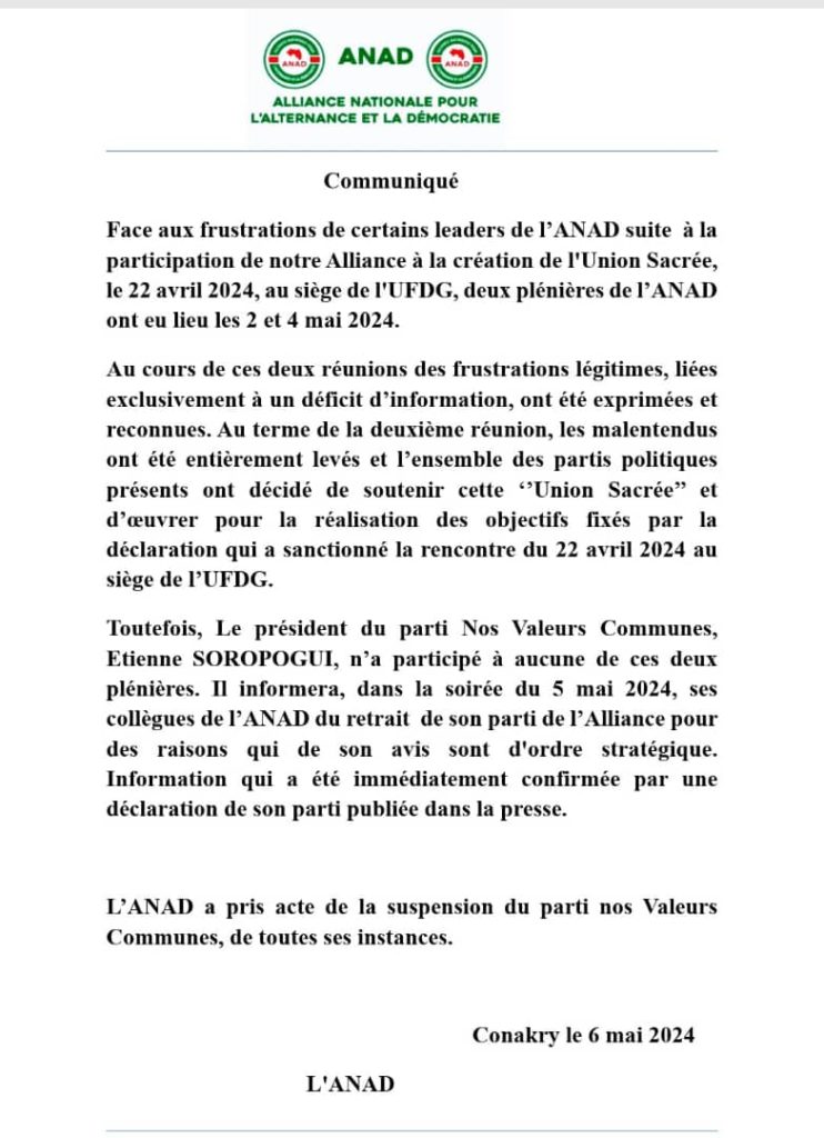 Comme annoncé hier soir, le parti d’Étienne Soropogui Nos Valeurs Communes à annoncé sa suspension de toutes les activités de l’ANAD pour des raisons stratégiques.