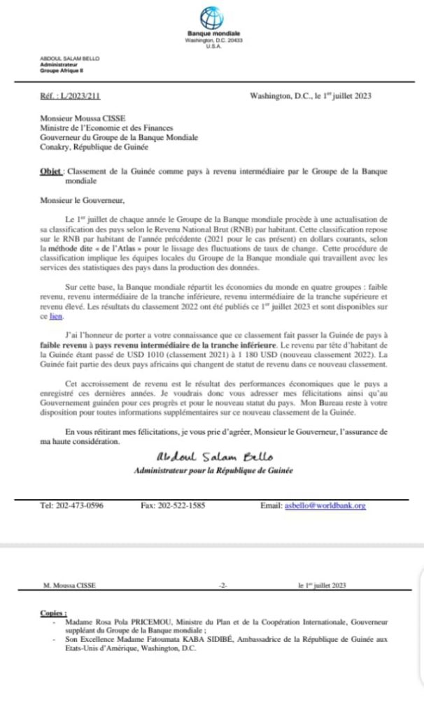 Ce classement fait donc passer la Guinée de pays à faible revenu à pays revenu intermédiaire de la tranche inférieure. Le revenu par tête d’habitant de la Guinée est passée de USD 1010 (classement 2021) à 1 180 USD (nouveau classement 2022).