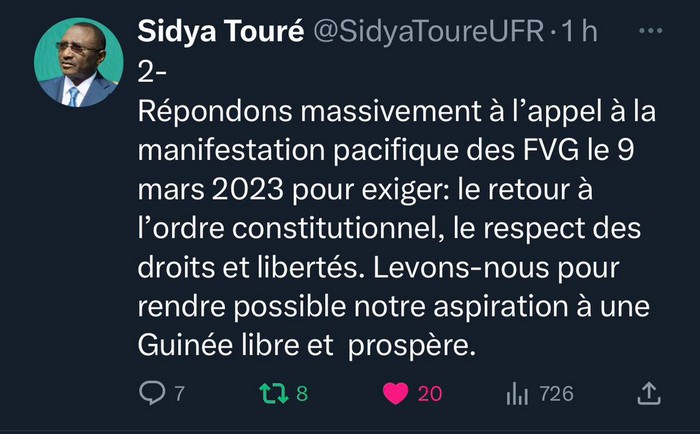 « Répondons massivement à l’appel à la manifestation pacifique des FVG le 9 mars 2023 pour exiger : le retour à l’ordre constitutionnel, le respect des droits et libertés. Levons-nous pour rendre possible notre aspiration à une Guinée libre et prospère. »