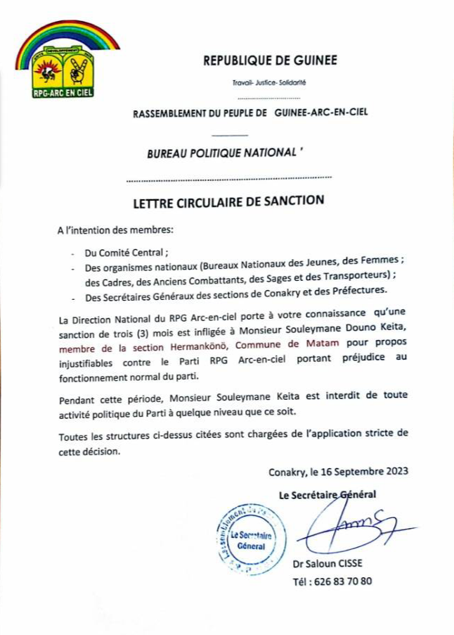 C’est une note du bureau politique national du parti, le RPG arc-en-ciel a rendu officiel la suspension de Souleymane Keita de la section « Hermakono » de la Commune de Matam.
