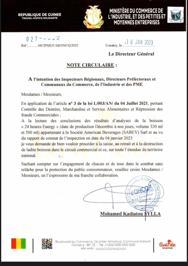 Le Ministère du commerce, de petites et moyennes entreprises a invité la Société American Beverages (SABEV) Sarl de retirer sa boisson « 24 heures Energy » sur le marché guinéen.