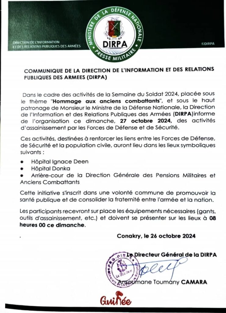 Dans le cadre des activités de la Semaine du Soldat 2024, placée sous le thème « Hommage aux anciens combattants », et sous le haut patronage de Monsieur le Ministre de la Défense Nationale, la Direction de l’Information et des Relations Publiques des Armées (DIRPA) informe de l’organisation ce dimanche, 27 octobre 2024, des activités d’assainissement par les Forces de Défense et de Sécurité.