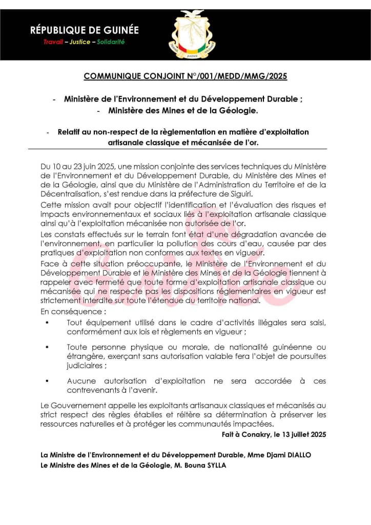 À la suite d’une mission conjointe menée du 10 au 23 juin 2025 à Siguiri, les ministères de l’Environnement, des Mines et de l’Administration du Territoire dénoncent une exploitation anarchique de l’or ayant gravement dégradé l’environnement. Dans un communiqué conjoint, ils annoncent des mesures fermes allant de la saisie d’équipements à des poursuites judiciaires contre les exploitants non autorisés.