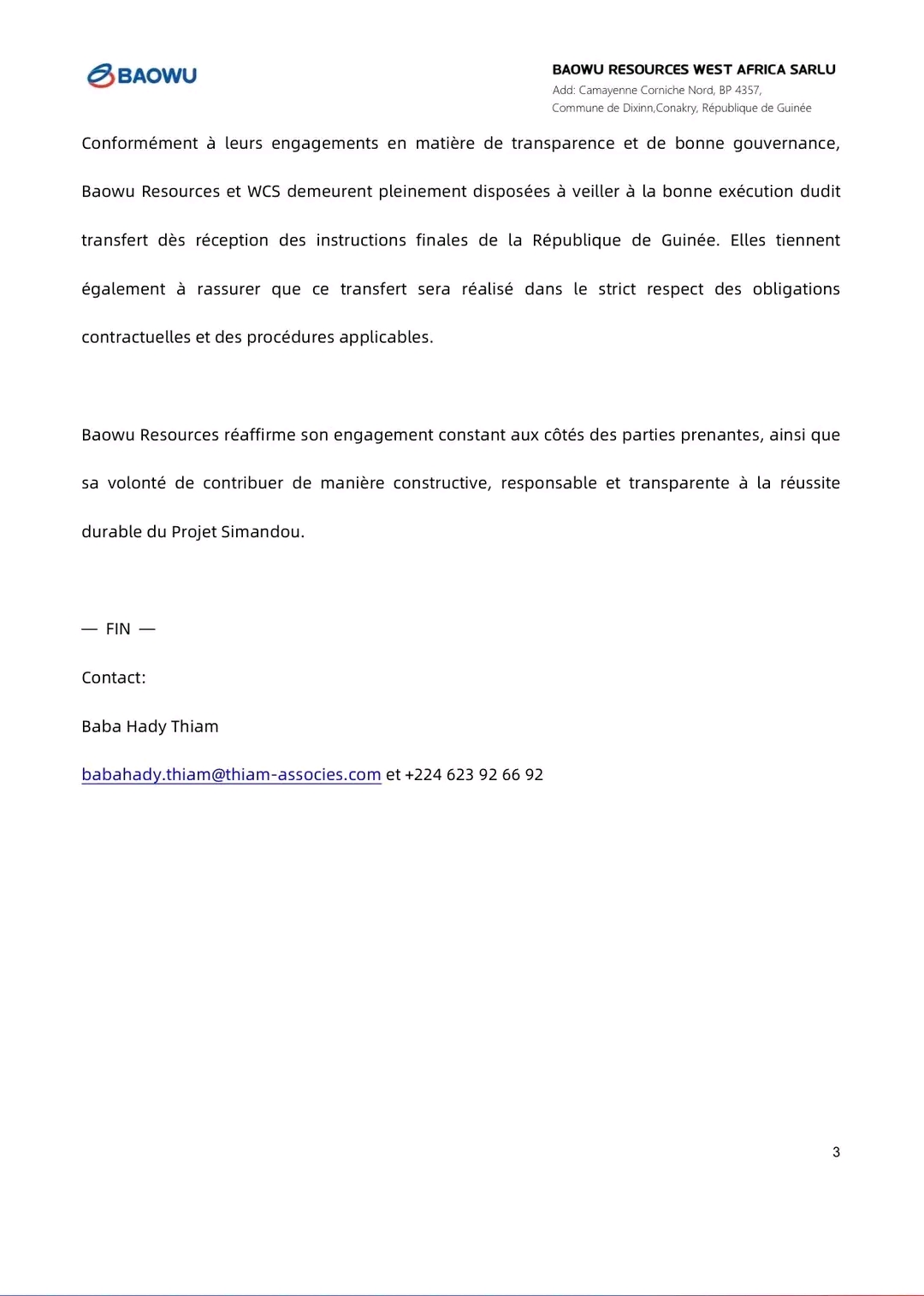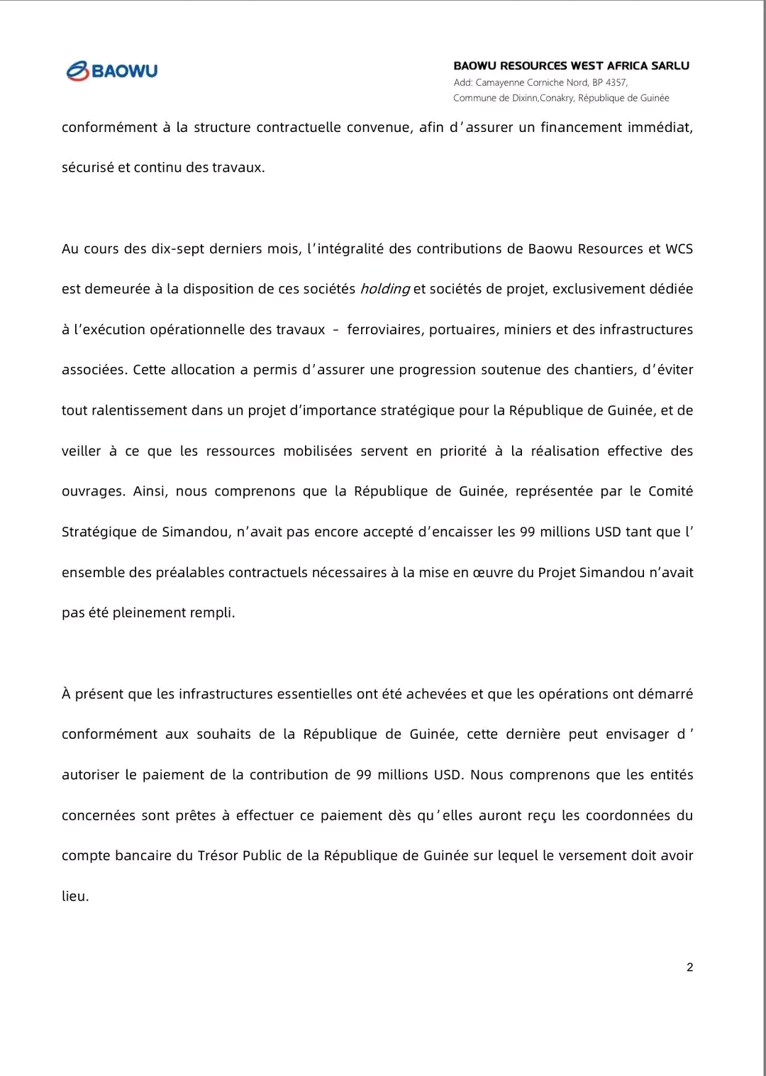Dans un communiqué publié ce 17 novembre 2025, Baowu Resources explique les conditions entourant la contribution initiale de 99 millions USD destinée au Projet Simandou. L’entreprise réaffirme avoir respecté toutes ses obligations contractuelles et se dit prête à effectuer le transfert dès réception des instructions finales de la République de Guinée.