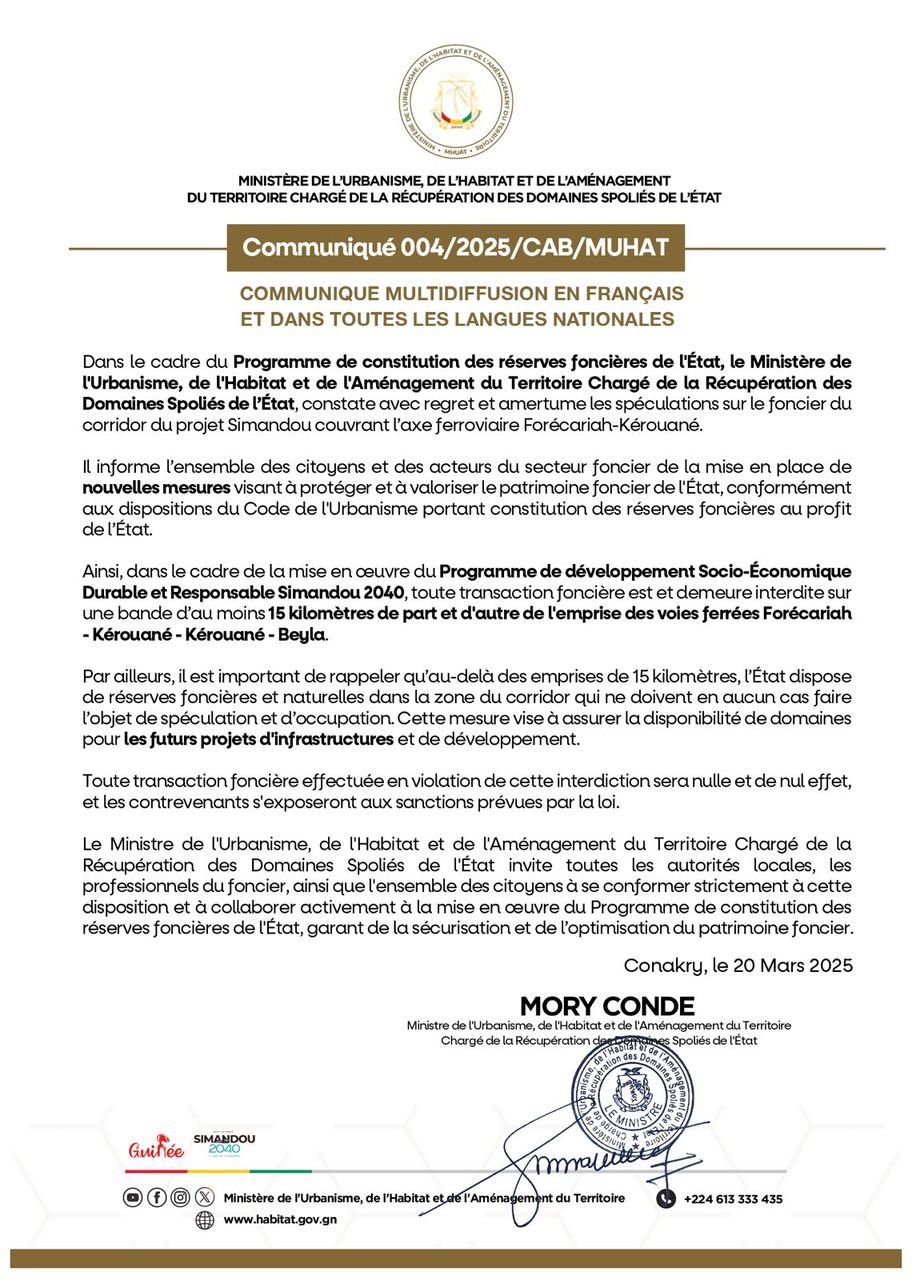 Dans le cadre de la constitution des réserves foncières de l’État, le ministère de l’Urbanisme, de l’Habitat et de l’Aménagement du Territoire interdit toute transaction foncière sur une bande de 15 kilomètres de part et d’autre du corridor ferroviaire Forécariah-Kérouané. Cette mesure vise à protéger le patrimoine foncier national et à garantir la disponibilité des terrains pour les futurs projets d’infrastructures liés au développement du projet Simandou.