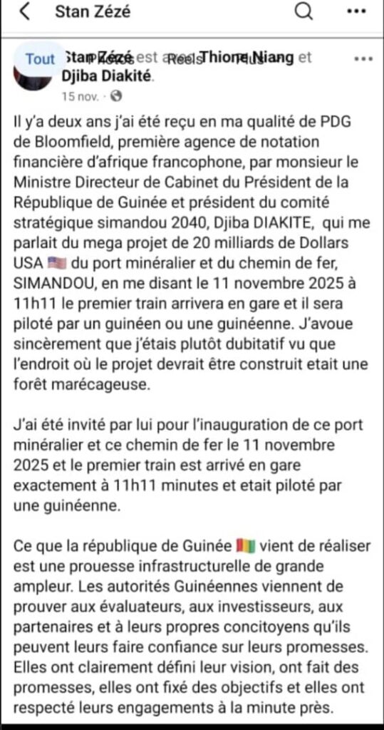 Les autorités l’ont promis, elles l’ont réalisé en surprenant les sceptiques. Le premier train du Trans guinéen, conduit par des guinéens, est arrivé à la gare le 11 novembre 2025 comme prévu par le comité stratégique de suivi dudit projet. Un exploit qui propulse davantage la Guinée parmi les pays sur lesquels les partenaires peuvent compter et qui force l’admiration des évaluateurs, partenaires et investisseurs. C’est le cas de Stanislas Zézé, PDG de Bloomfield, première agence de notation financière d’Afrique francophone. Deux ans auparavant, à Conakry, lorsque le président du comité stratégique de simandou, par ailleurs, Ministre Directeur de Cabinet de la Présidence, Djiba Diakité, affirmait que cette étape serait franchie le 11 novembre 2025 à 11H 11, le PDG de Bloomfield était «dubitatif». Mais après avoir vécu la réalisation de cette prouesse, il a fait un témoignage anecdotique sur sa page Facebook. Lui qui était dubitatif, ne cache pas sa surprise et son admiration. Ci-dessous son témoigne !