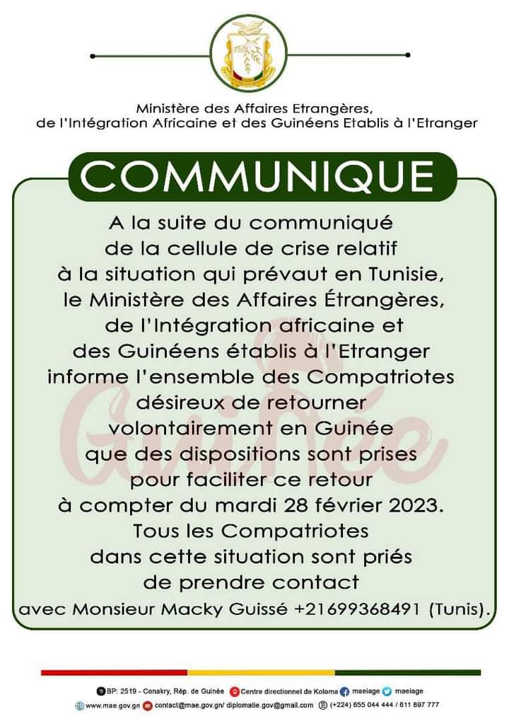 Le département géré par Dr Morissanda Kouyaté informe l’ensemble des compatriotes désireux de retourner volontairement en Guinée que des dispositions sont prises pour faciliter leur retour à compter du mardi 28 février 2023.