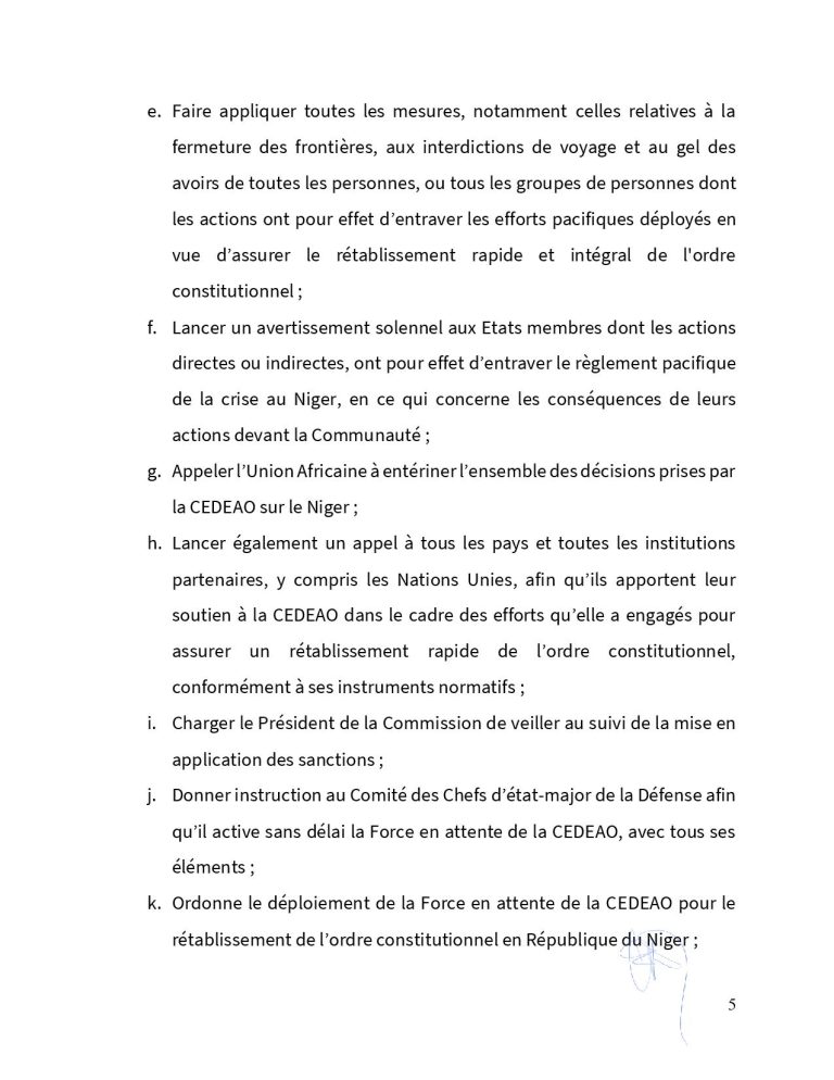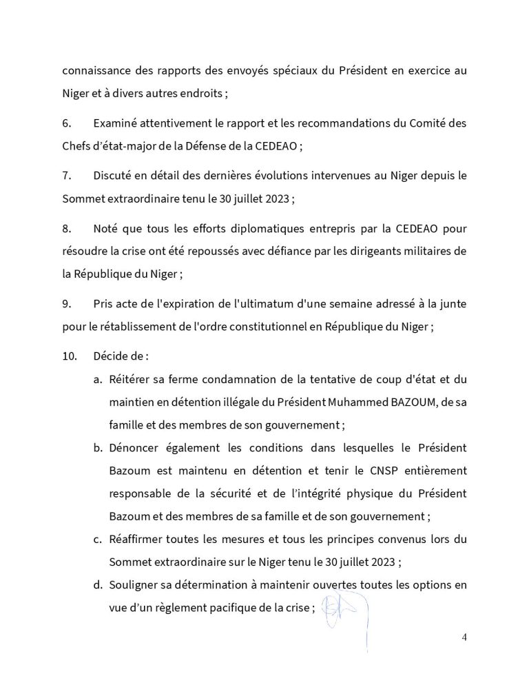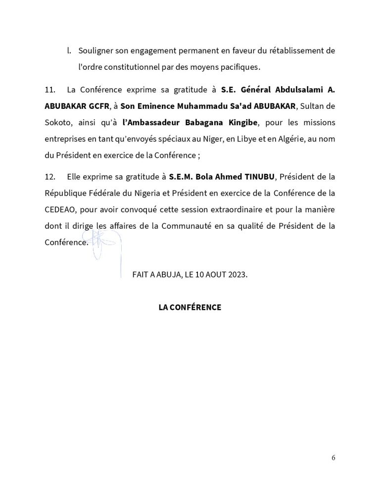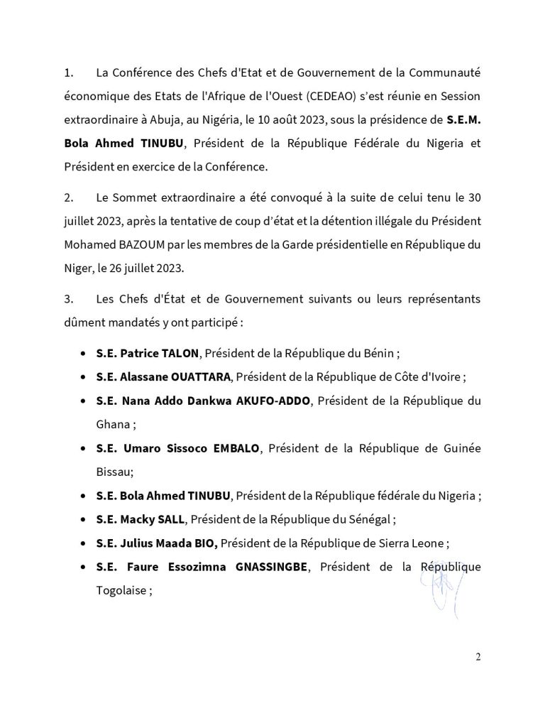 Situation Politique au Niger : voici le communique Final sur le deuxième Sommet Extraordinaire de la Conférence des Chefs d’Etat et de Gouvernement de la CEDEAO