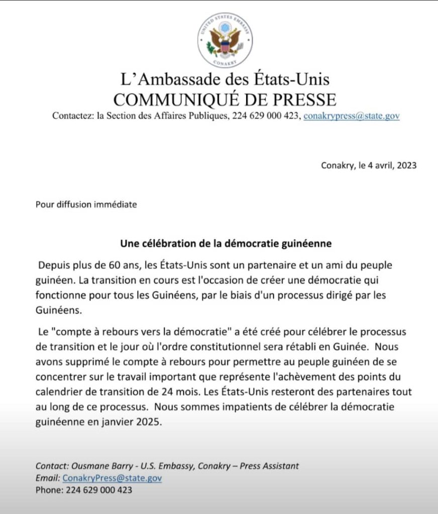 Dans un communiqué publié ce mardi 4 avril 2023, l’ambassade des USA tente de justifier cette suppression pour permettre aux Guinéens de se concentrer sur la mise en œuvre des différents points du chronogramme de la transition.