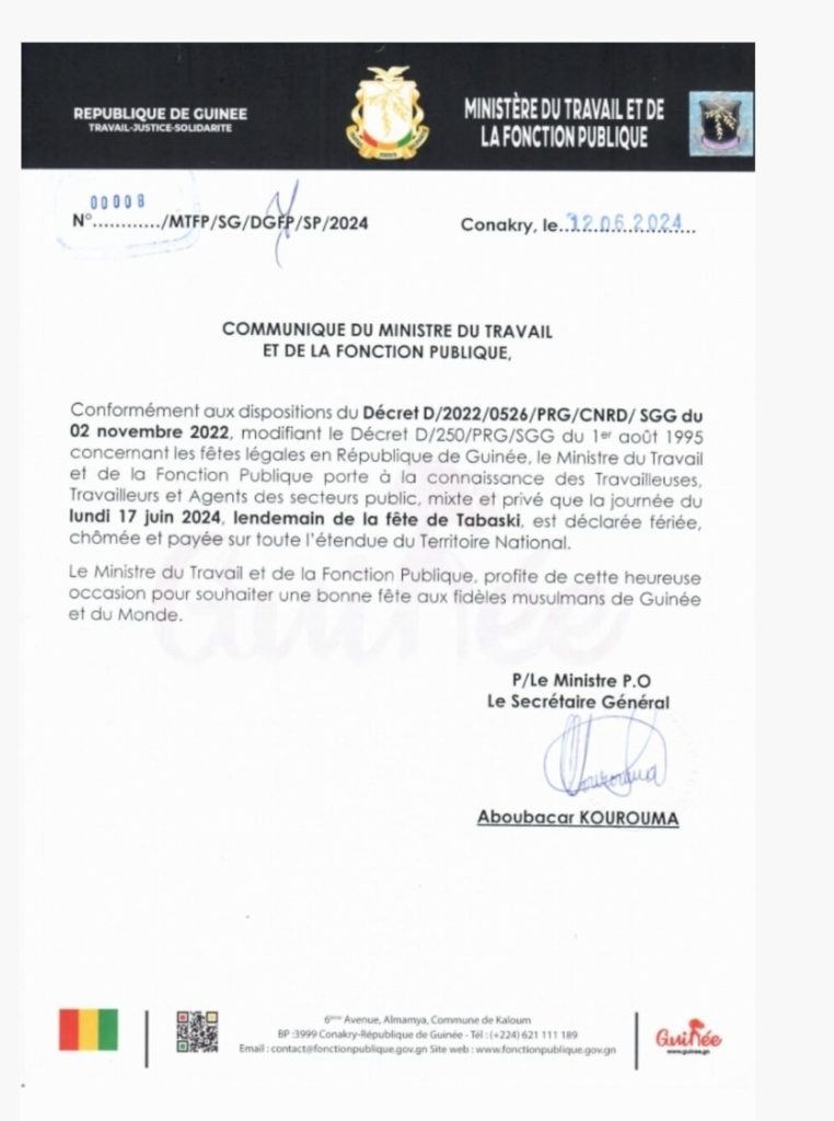 Dans un communiqué publié ce vendredi 14 juin 2024, le ministère du travail et de la fonction publique annonce que le lundi 17 juin 2024, est déclaré férié, chômé et payé sur toute l’étendue du territoire guinéen. Ci-dessous le communiqué :