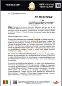 « EDG perd cent milliards de francs guinéens ( 100.000.000.000 GNF ) par an à cause du vol d’électricité et les fraudes sur le réseau électrique « , lit-on dans ce communiqué du Ministère de la Justice et des Droits de l’Homme. A travers ce courrier, le département dirigé par Alphonse Charles Wright vient répondre à la sollicitation de EDG qui demande un « appui institutionnel » dans ce combat contre cette fraude.