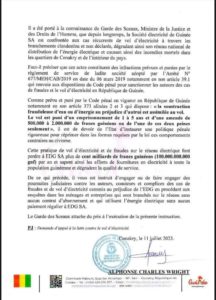 Vol et fraude d’électricité : Charles Wright prend une décision https://planete7.info/vol-et-fraude-delectricite-charles-wright-prend-une-decision/ https://planete7.info/vol-et-fraude-delectricite-charles-wright-prend-une-decision/#respond Tue, 11 Jul 2023 20:42:54 +0000 https://planete7.info/?p=22058 « EDG perd cent milliards de francs guinéens ( 100.000.000.000 GNF ) par an à cause du vol d’électricité et les fraudes sur le réseau électrique « , lit-on dans ce communiqué du Ministère de la Justice et des Droits de l’Homme. A travers ce courrier, le département dirigé par Alphonse Charles Wright vient répondre à la […]]]>