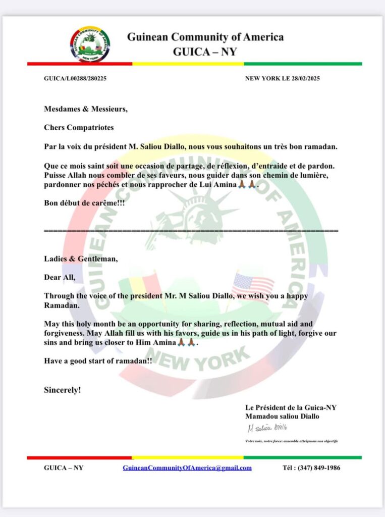 Dans une déclaration publiée sur ses canaux de communication, le président de la communauté guinéenne de New-York a souhaité un bon ramadan à ses compatriotes ainsi qu’à toute la communauté musulmane.