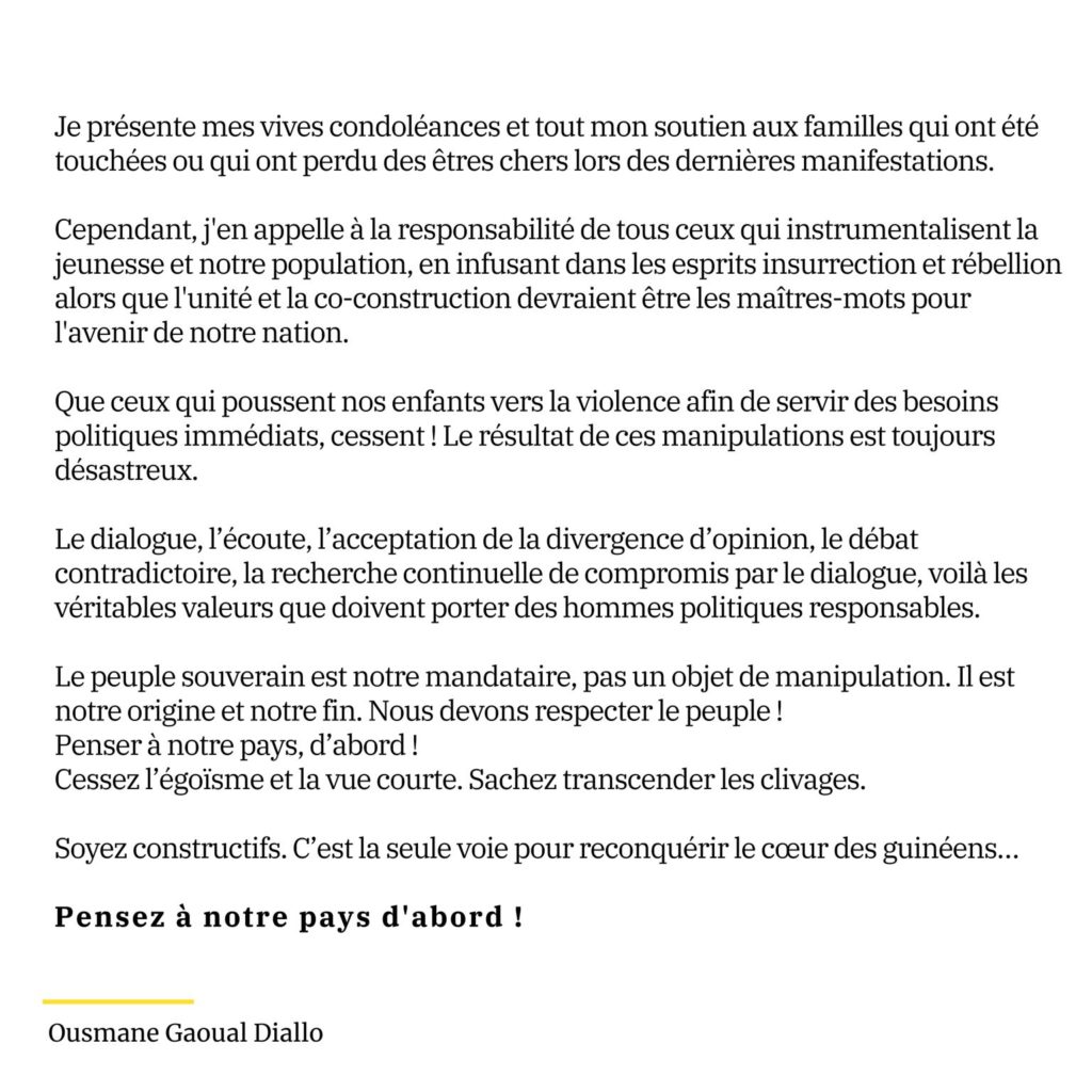 A l’entame, Ousmane Gaoual Diallo a présenté ses condoléances aux familles des victimes avant de lancer un appel à « ceux qui tentent d’instrumentaliser la jeunesse ».