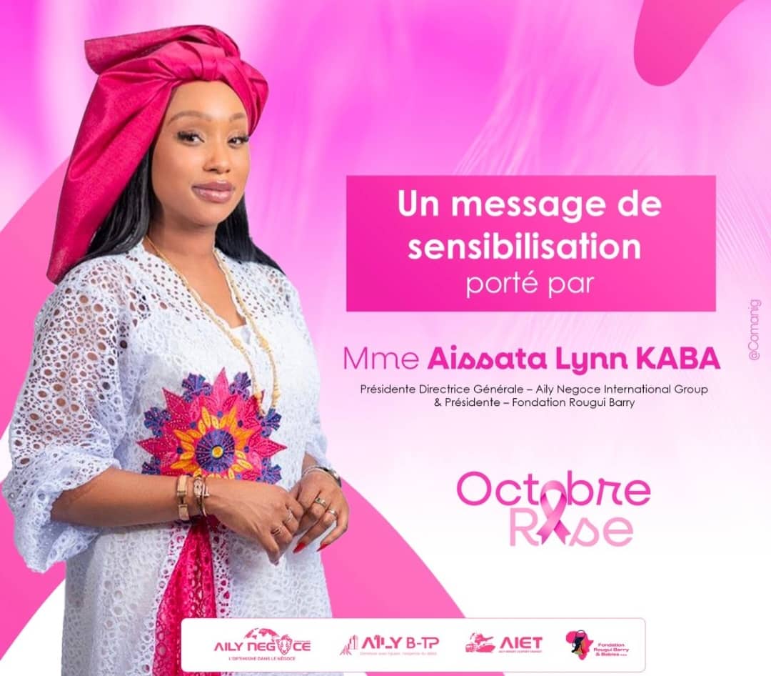 Dans le cadre du mois consacré à la lutte contre le cancer du sein, Madame Aissata Lynn Kaba, Présidente Directrice Générale du groupe Aily Négoce Internationale et Présidente de la Fondation Rougui Barry, a livré un message empreint d’émotion, de solidarité et d’espoir. Par ses mots sincères, elle rappelle que « Octobre Rose n’est pas seulement une campagne, c’est un élan d’amour ».