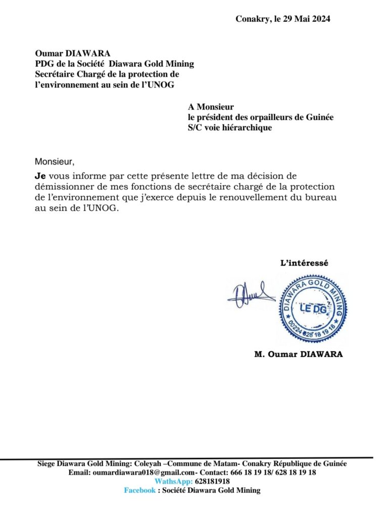 Empereur Oumar Sanitigui Diawara, PDG de Diawara Gold Mining et secrétaire en charge de la protection de l’environnement au sein de l’UNOG rassure ses membres qu’il restera disponible à l’union. Ci-dessous ses lettres de démission adressées au président et au membres de l’UNOG :