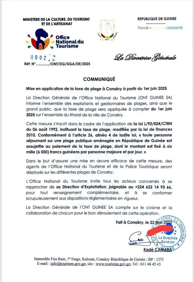À partir du 1er juin 2025, les visiteurs des plages aménagées de Conakry devront s’acquitter d’une taxe de 6 000 francs guinéens par jour et par adulte. L’Office National du Tourisme, en collaboration avec la Police Touristique, veillera à l’application stricte de cette mesure, conformément à la loi en vigueur.