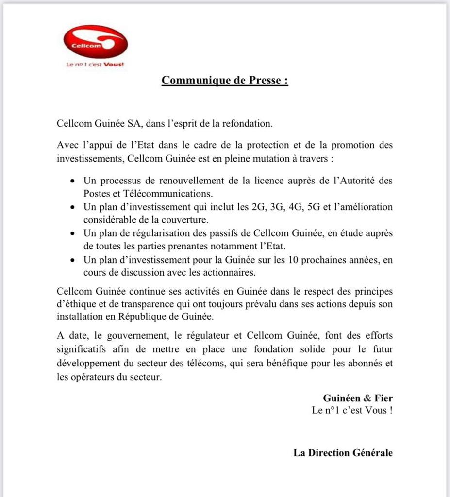 Dans un communiqué publié ce lundi 30 janvier 2023, la société de téléphonie Cellcom Guinée SA informe que dans le cadre de la protection et de la promotion des investissements, qu’elle est en pleine mutation. Ce, dans l’esprit de la refondation de l’Etat.